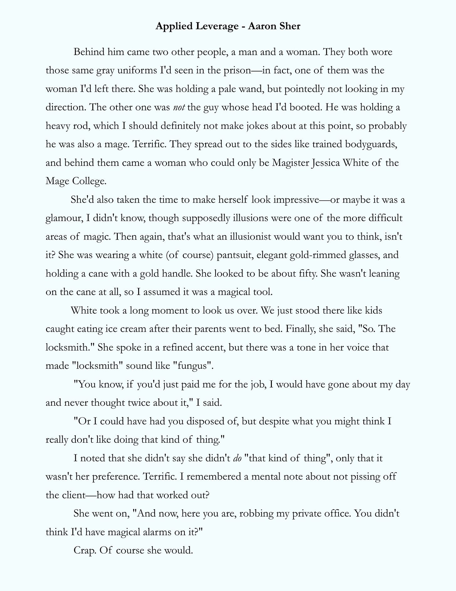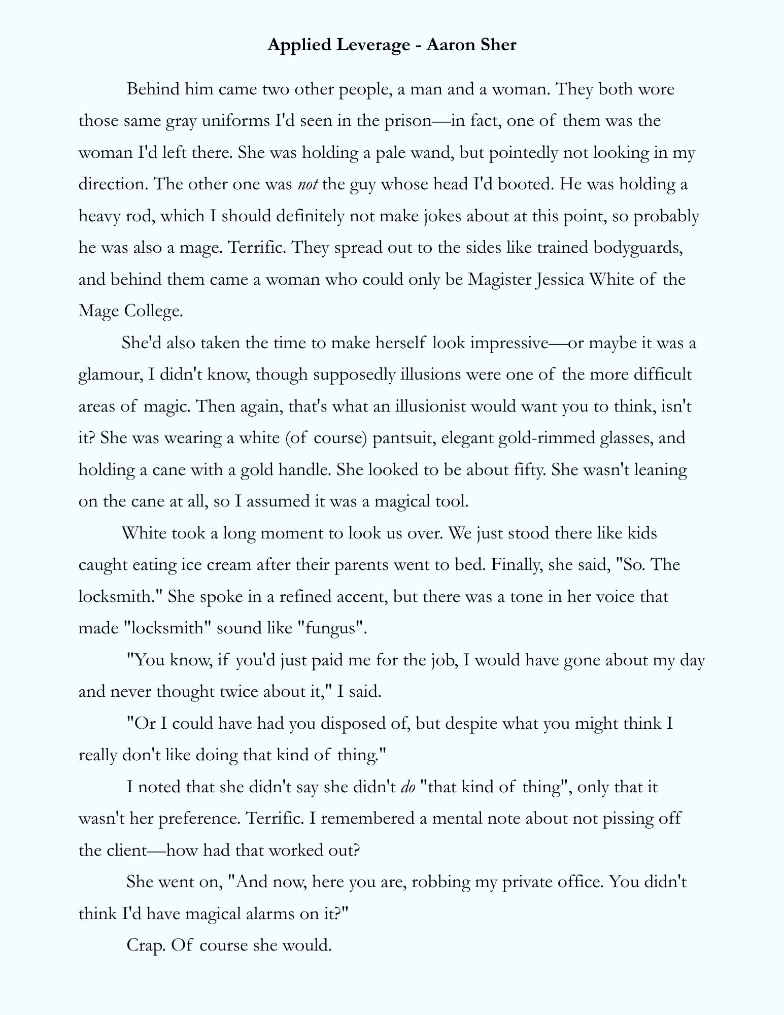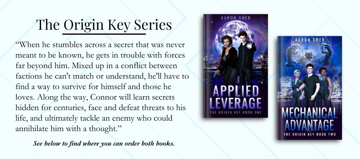 The first book is called Applied Leverage for several reasons, but the main one is the message: a small force, properly applied, can create great results. Connor is pretty much always the least powerful person in every room, but he prevails through cleverness and good friends, and that's the message I'd like readers to walk away with—that power is not the only, or often even the best, answer.