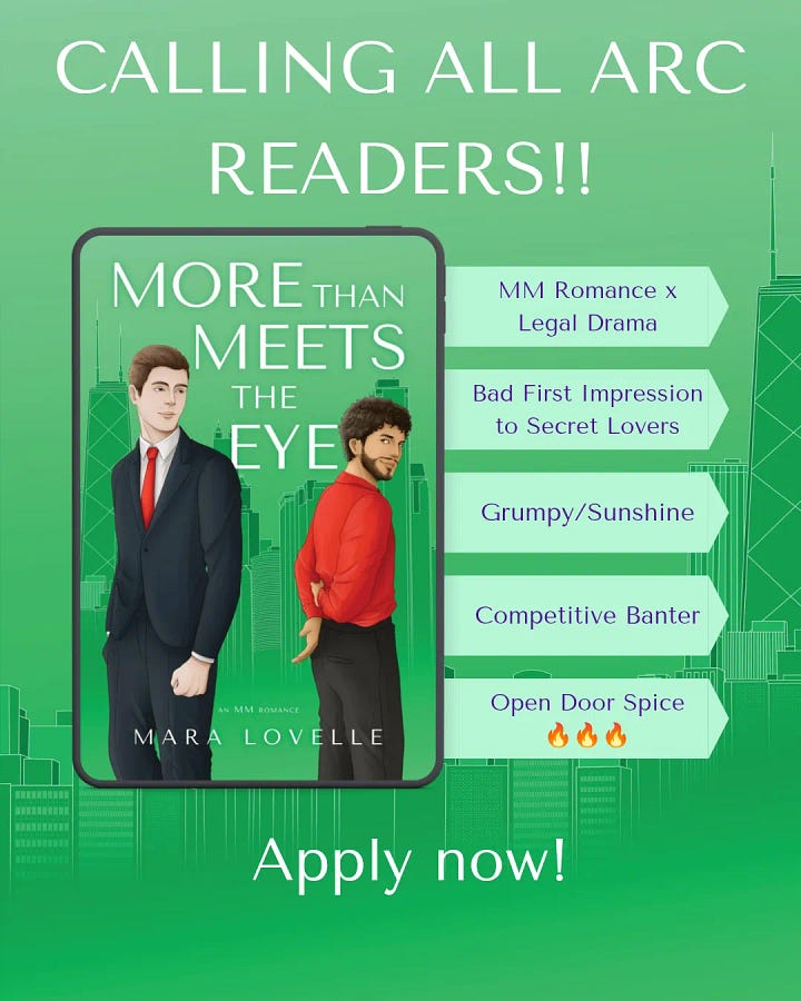 More than Meets the Eye by Mara Lovelle: An MM romance brimming with heart, laughter, and heated tension that navigates the messiness of beauty, and proving love cares little of a five-year plan. Sign up for it here!