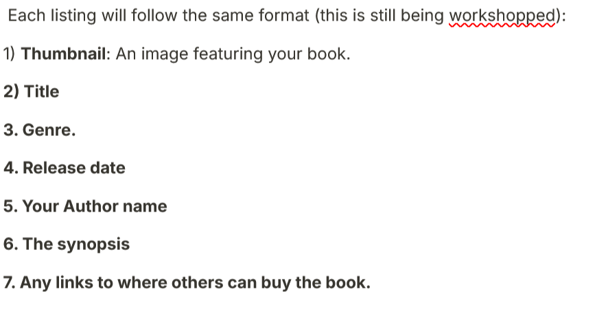 Editing to add: You can now fill out the form to get your books listed. There is a listing fee, but I won’t be charging you until I’m ready to open the catalog and add your listings. You can fill the form out here: