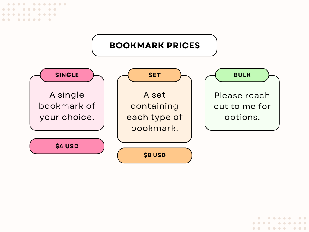 So for single bookmarks, it’s just $4 USD, and for sets (one-of-each) it’s $8 USD (25% off). But if you’re interested in helping the directory grow, and would like these in bulk, let me know and we can discuss options.