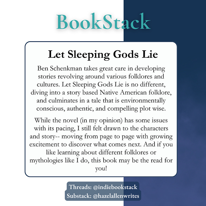 ”Reading stories centered around characters with Tourette Syndrome is very important to me, and how it ties to my family history. And Ellie Terry, who has Tourette Syndrome, offers a fantastic intro into learning more about the condition, and the importance of being kind and understanding towards others— even if you don’t know why they make silly little noises, or twitch their face seemingly at random.”Let Sleeping Gods Lie by Ben Schenkman: I consider myself a decent fan of Ben’s work, and reading about various folklores and mythologies. So, when I found out that he was writing about Native American folklore, I knew I had to give it a shot.