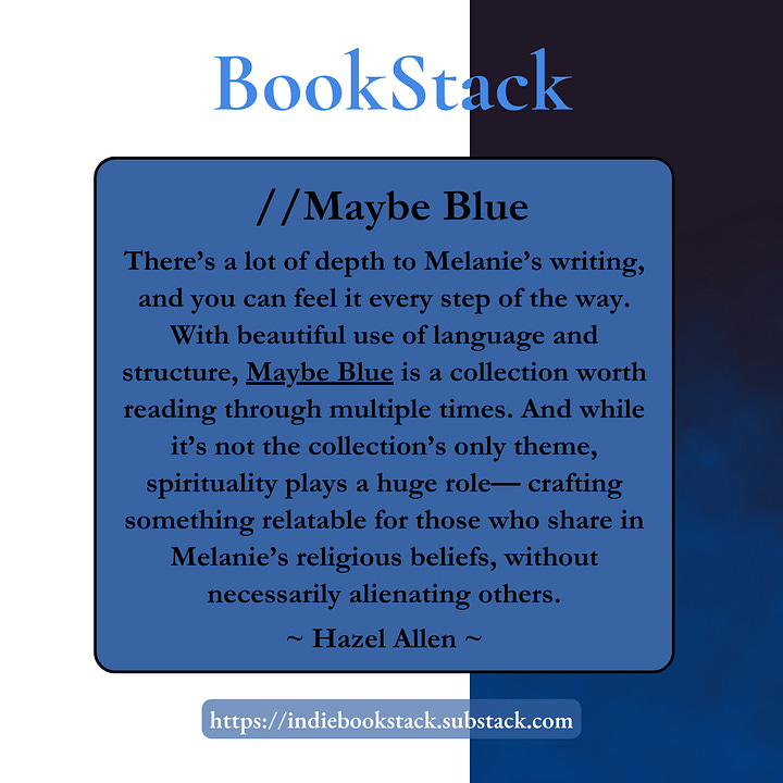 There’s a lot of depth to Melanie’s writing, and you can feel it every step of the way. With beautiful use of language and structure, Maybe Blue is a collection worth reading through multiple times. And while it’s not the collection’s only theme, spirituality plays a huge role— crafting something relatable for those who share in Melanie’s religious beliefs, without necessarily alienating others. I gave this read a 5/5.