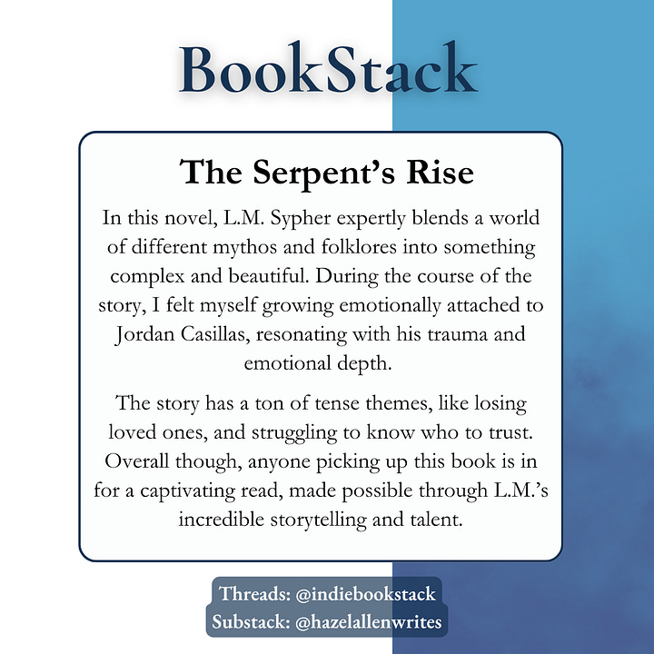 Many of the essays drew from each writer’s life experiences, from dealing with issues like discrimination, existing in the pandemic, and much more. It’s a really inspiring guide that made me think about how I too could push myself to write a 1000 words everyday. And I highly recommend listening, or reading this book if you need a little push yourself.The Serpent’s Rise by LM Sypher: This was a book I felt drawn to based on the cover alone— reminding me of something like The Lightning Thief. And while it’s recommended not to judge a book by its cover, I’m glad I did. This one was fantastic!