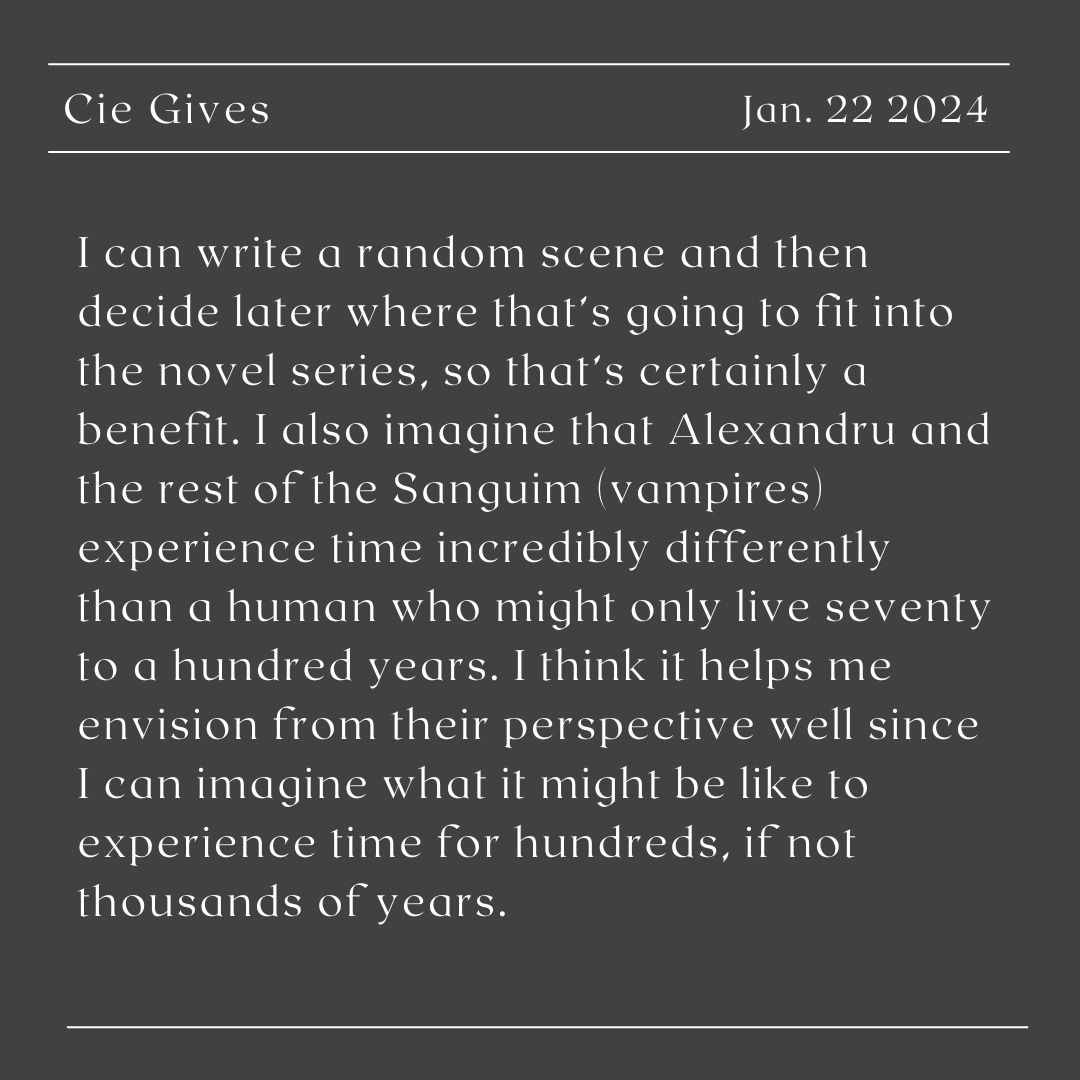 That’s it for the main part of the interview discussing the book. This next part is more personal, focused on Cie Gives them self.