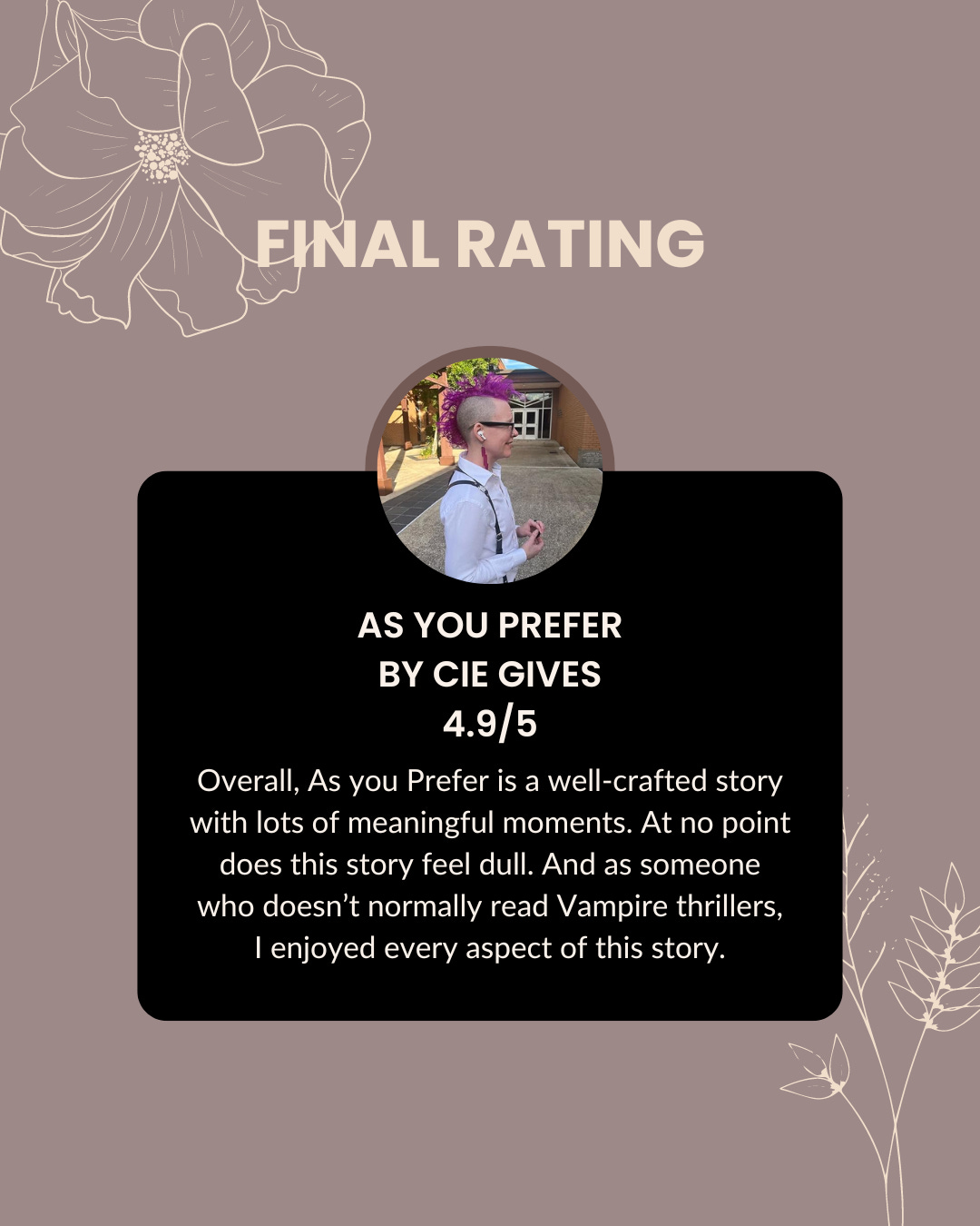 Overall, As you Prefer is a well-crafted story with lots of meaningful moments. At no point does this story feel dull. And as someone who doesn’t normally read Vampire thrillers, I enjoyed every aspect of this story. It is intense and complicated, but fresh with a lot to say. There are moments in the story that are triggering to some, leading me to think: “What the fuck just happened?” But those moments serve the narrative well, and I don’t think the story would’ve hit the same otherwise.