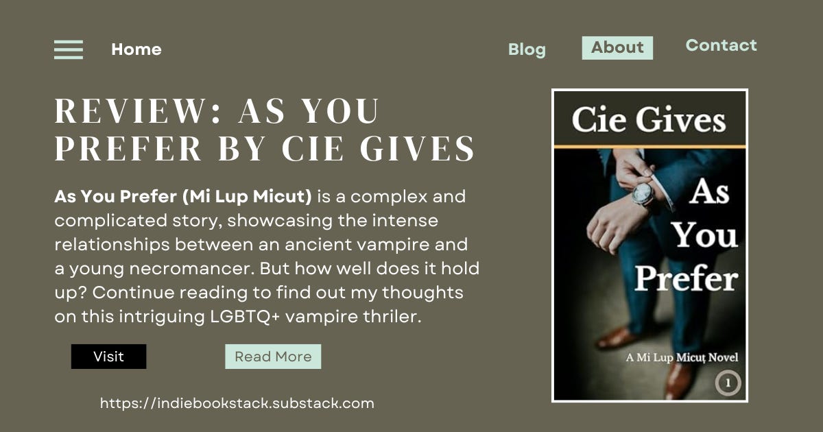 And that is it for this Review and Author Spotlight. If you want to read Cie Gives’ As You Prefer, just click on the link below. Currently, the eBook is $2.99 USD and the Paperback is $9.99 USD.