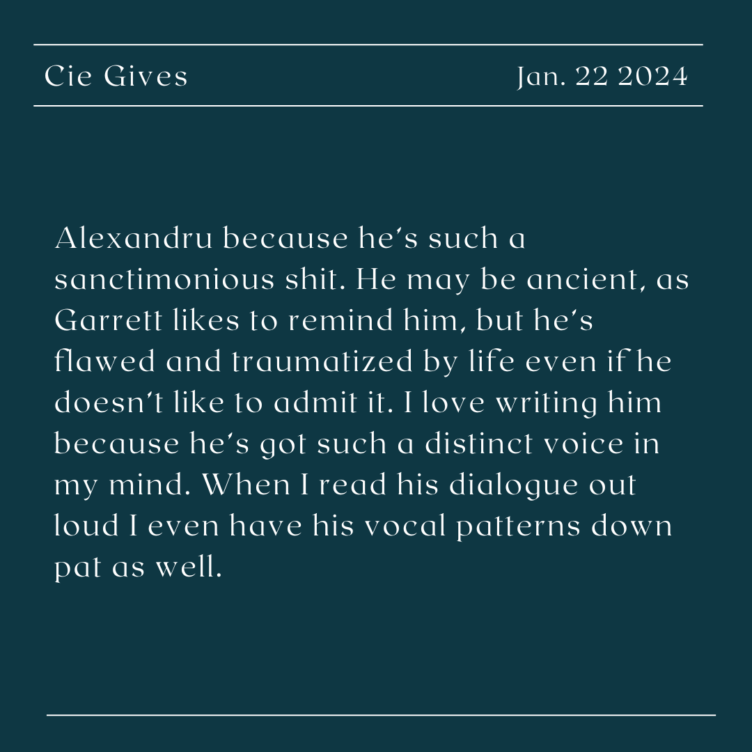 Anything that Alexandru says feels impactful to me because I hope it leaves the reader wondering what he’s actually thinking and his humor is so dry it’s painful.