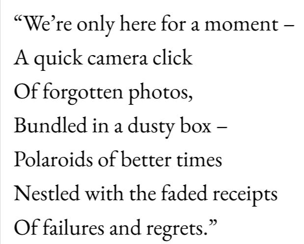 What does this poem convey to you? Can you feel the sensation behind it, how it moves you from one side of a picture to the next? This piece takes us through the embodiment of life, a reminiscence of the speed in which life moves. How you’re here one minute, and a memory the next. Maybe left forgotten about? But can that truly be?