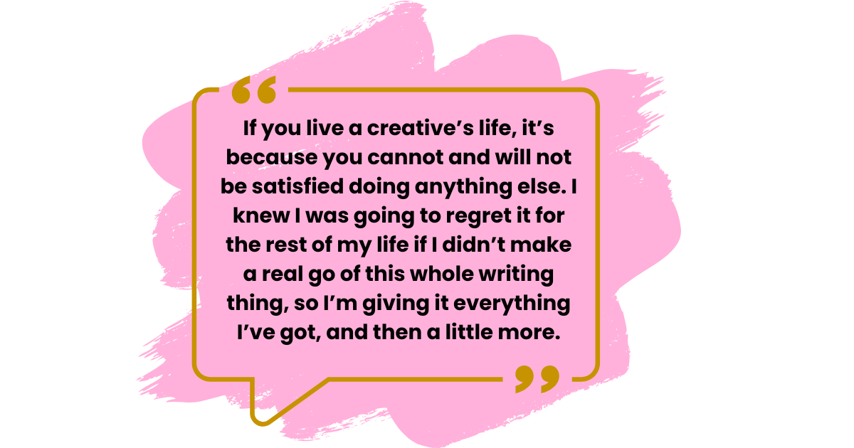 If you live a creative’s life, it’s because you cannot and will not be satisfied doing anything else. I knew I was going to regret it for the rest of my life if I didn’t make a real go of this whole writing thing, so I’m giving it everything I’ve got, and then a little more.