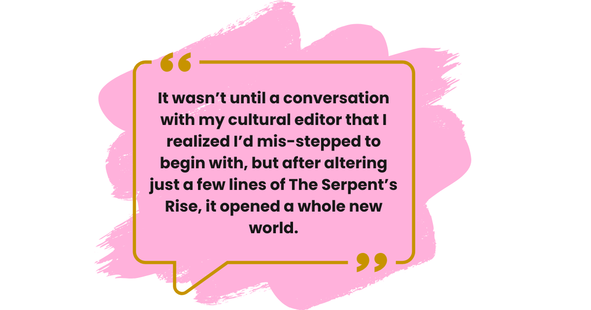 When I have writer’s block, it means one of two things: the story either isn’t fleshed out enough, or I’m on the wrong track. Book two has been difficult for me to get jump-started, because I was having trouble tackling some big plot-related questions, and finding loopholes in the safety net I’d woven for my main character. It wasn’t until a conversation with my cultural editor that I realized I’d mis-stepped to begin with, but after altering just a few lines of The Serpent’s Rise, it opened a whole new world. In other words, “Writer’s Block” is just an invitation for me to dig deeper and uncover the pieces of the story I didn’t know fit together, or what’s sticking out like a sore thumb.