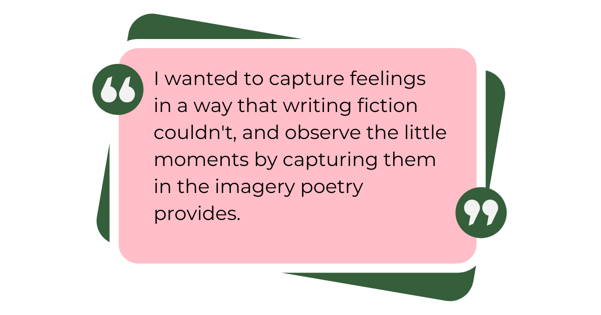 What drew me into writing poetry was exploring a plethora of themes and emotions I encountered throughout life. I wanted to capture feelings in a way that writing fiction couldn't, and observe the little moments by capturing them in the imagery poetry provides.