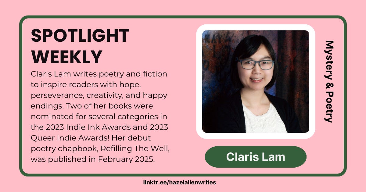 Hey there and welcome back for another Spotlight Weekly! This time we’re delving into Mystery and Poetry writer Claris Lam! She’s been writing for most of her life, but five years for books, and three for publishing. Not only that but some of her works have been nominated for awards such as the 2023 Indie Ink Awards, and the 2023 Queer Indie Awards!