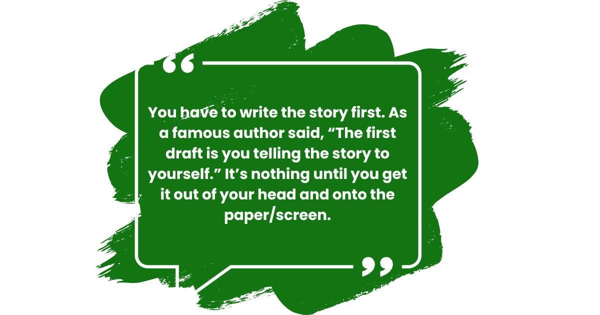 You have to write the story first. As a famous author said, “The first draft is you telling the story to yourself.” It’s nothing until you get it out of your head and onto the paper/screen. Therefore write it quickly, write too much, and don’t look back until the end (unless you get completely lost).