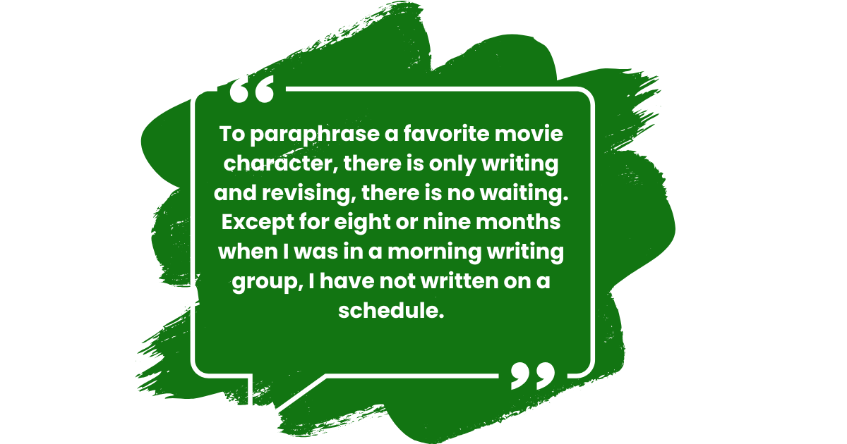 To paraphrase a favorite movie character, there is only writing and revising, there is no waiting. Except for eight or nine months when I was in a morning writing group, I have not written on a schedule. Someone has said that the muse doesn’t always come, but when it does, you should be there, implying that you should be in your writing place on a regular schedule. This is great advice. I just can’t make it work for me.