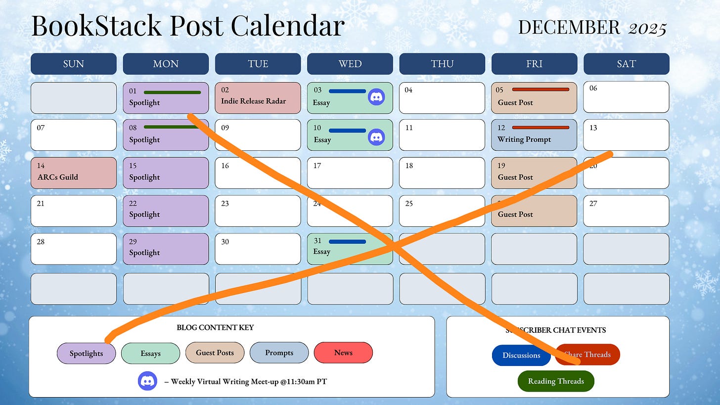Moving on, let’s address the main thing in this update. I’m going to be adjusting the content calendar for December— and hence, officializing my unofficial holiday break a little more. Here’s what changing.