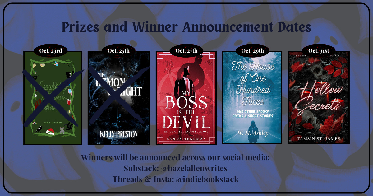 Oct. 23rd:Caught Up In Leaves and VinesCollection by Jake Graham, eBook. (This one actually contains both related and non-related short stories to our Giveaway’s themes)Oct. 25th:The Demon to Your Right by Kelly Preston, eBook.Oct. 27th: My Boss is the Devil by Ben Schenkman, Audiobook.