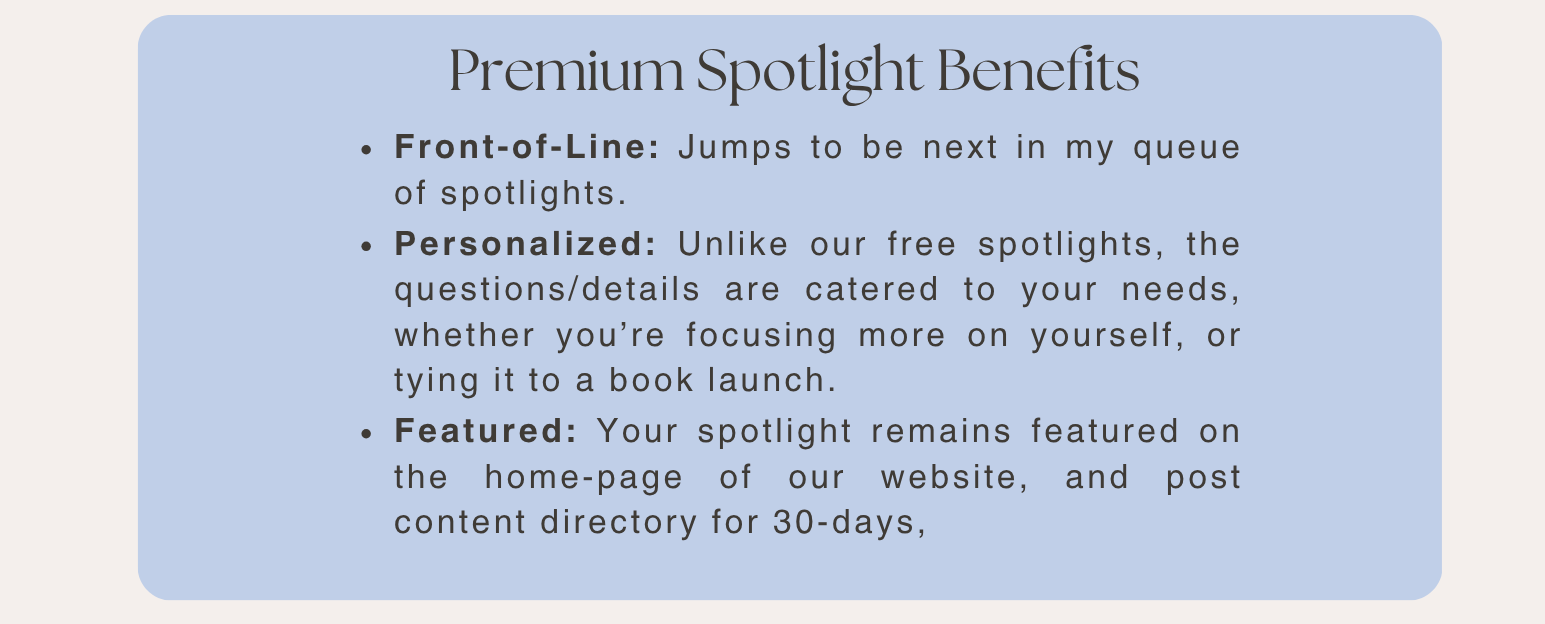 Free: We have a variety of free services, including spotlights, book reviews, and more. Here’s a brief look into each.